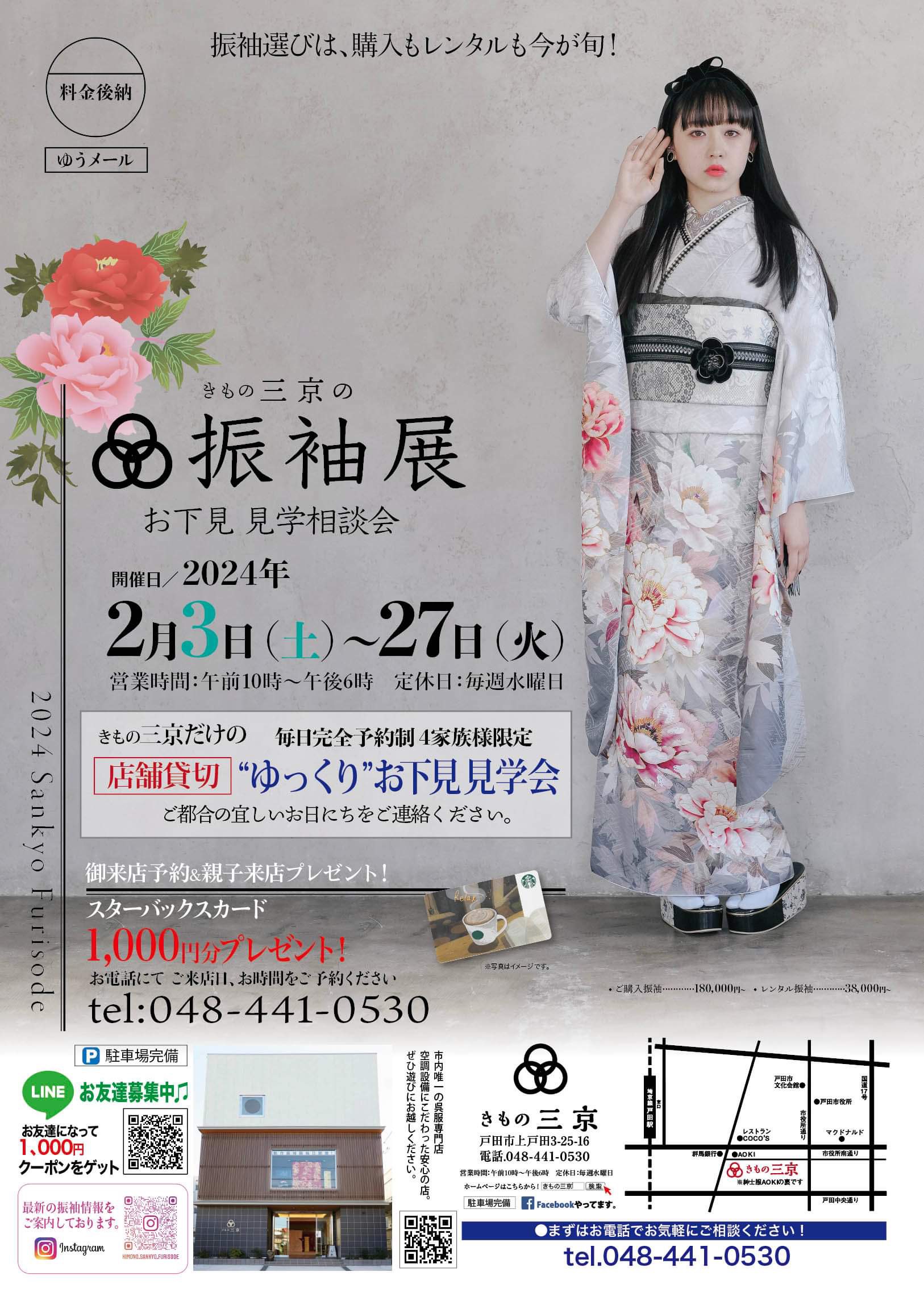 2024/02/02 2月3日(土)〜27日(火)の期間、『きもの三京レンタル・購入振袖相談会』を開催いたします。 王道の人気柄「古典柄振袖」を中心に今シーズン大人気の「くすみ系振袖」や「レトロ振袖」など総点300枚の振袖をレンタル・ご購入いただけます♪ また、ママ振袖・姉振袖のリメイク相談も承っておりますのでお気軽にお問合せ下さい。 素敵な振袖がたくさんあるのでお時間に余裕をもってお電話かメールでの御来店予約をお待ちしております♪