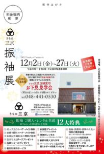 12月2日(金)〜27日(火)の期間、きもの三京店内2階振袖展示ルームで『きもの三京店舗貸切 お下見見学会』を開催いたしております。」