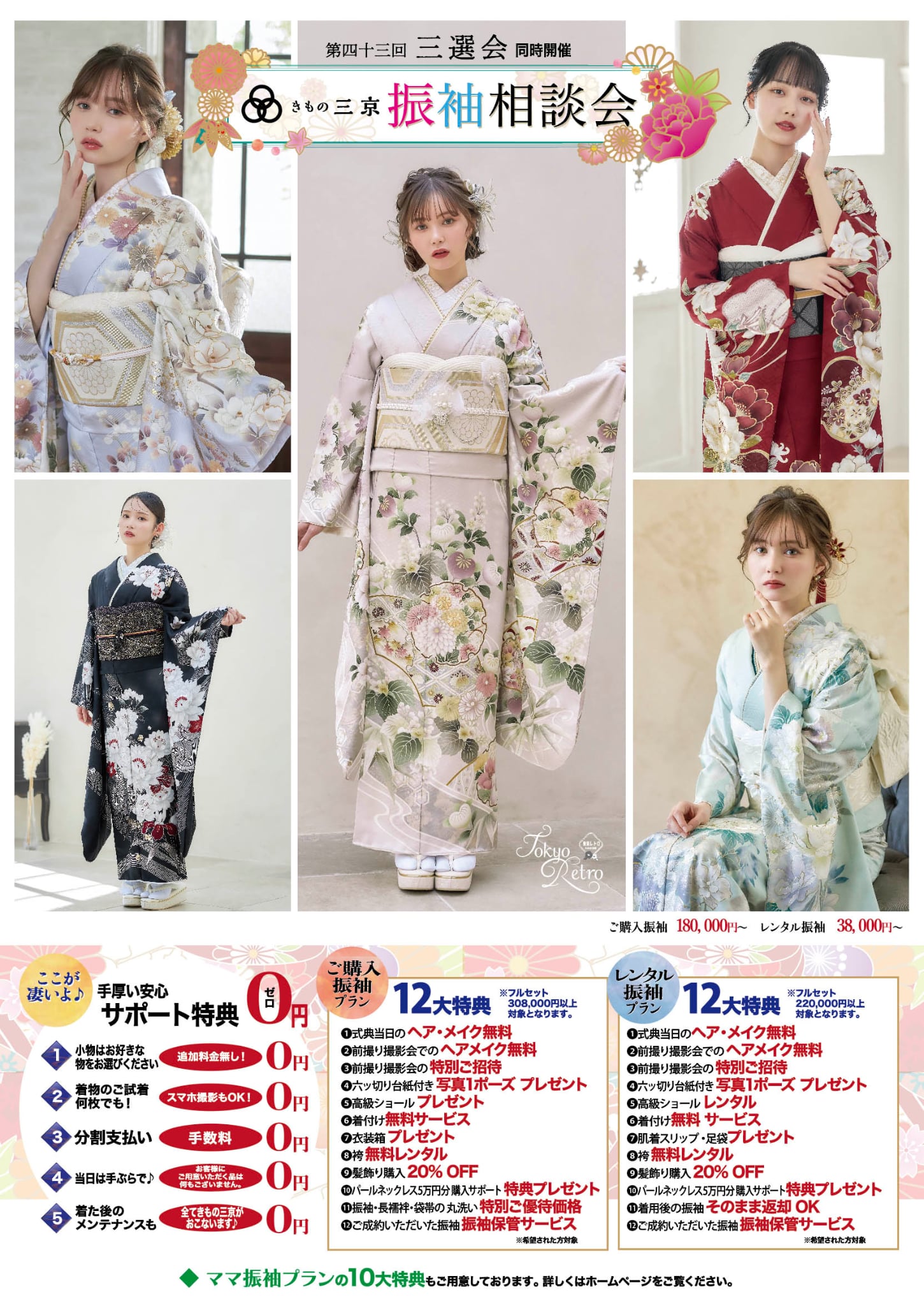 期間中はきもの三京オリジナル創作着物から古典柄振袖・くすみ系振袖・レトロ柄振袖など総点300点を展示いたします。